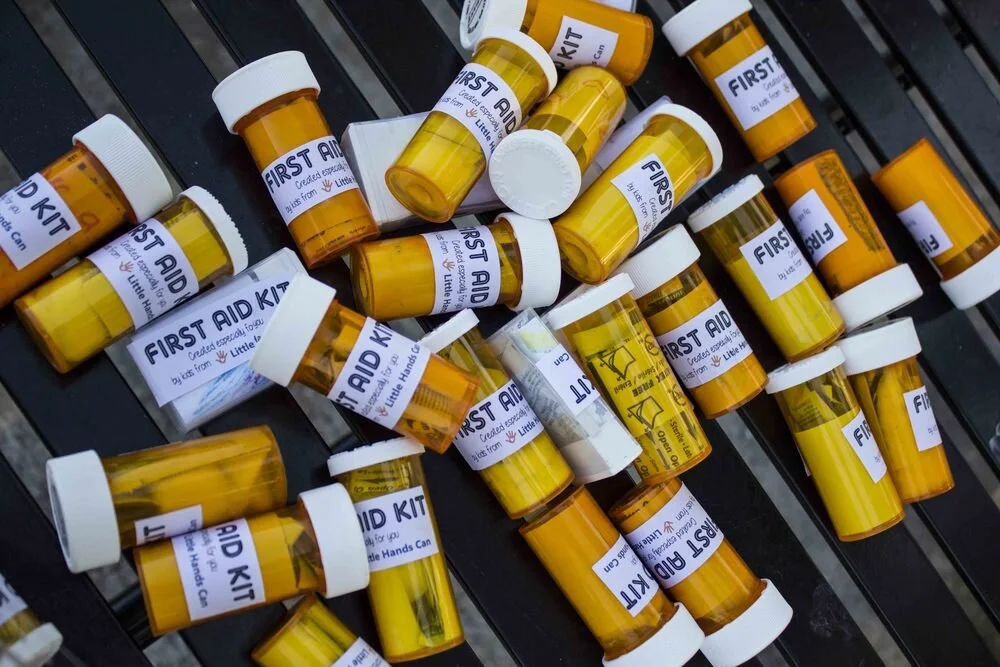 Supplies: We usually compile these kits in emptied/cleaned/de-labeled pill bottles (although if you don’t have any pill bottles you can use a snack-sized ziplock baggie). Each Mini First Aid Kit contains a personalized picture or note from the children, two band aids, an alcohol wipe, a packet of bacitracin, and a cotton swab.